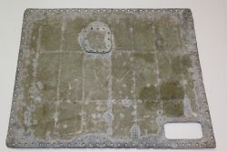 Pokrywa rewizyjna mechanizmu sterowania klap ze spodu skrzydła radzieckiego samolotu bombowego Petlakow Pe-2. Resztki zachowanej zielonej farby, brak widocznych sygnatur. Poszycie i kratownica wzmacniająca nitowane. Pochodzi z rejonu lotniska wojskowego w Łabuniach pod Zamościem.