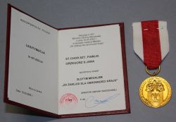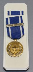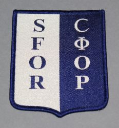 Naszywka naramienna SFOR z misji pokojowej ONZ w byłej Jugosławii. W kształcie tarczy, podzielona wzdłuż na pół, dwukolorowa. Dwa napisy SFOR w alfabecie łacińskim i cyrylicą.