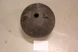 Kula armatnia stalowa z otworem, pusta w środku. Po dwu stronach otworu wgłębienia, pozostałości po mocowanych uchwytach. |