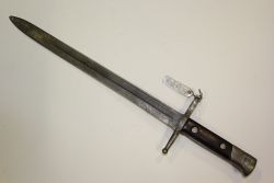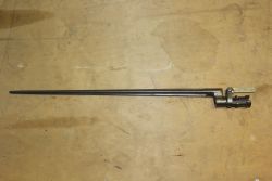 Bagnet zastępczy do karabinu systemu Mauser. Głownia prosta, jednosieczna o romboidalnym przekroju, pióro obosieczne. Rękojeść stalowa, lekko wyprofilowana, jelec niekompletny - brak fragmentu pierścienia. Brak pochwy. |