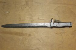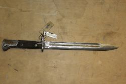 Bagnet do karabinu systemu Carcano wz. 1891. Głownia prosta, jednosieczna o jednym zbroczu. Głowica stalowa, okładki drewniane, jelec prosty z pierścieniem, brak pochwy. |