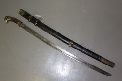 Szaszka wz. 27, regulaminowa broń kawalerii Armii Czerwonej. Klinga jednosieczna o jednym zbroczu, rękojeść otwarta bez jelca, głowica mosiężna, okładki chwytu drewniane, pochwa drewniana obciągnięta materiałem, trzewik mosiężny, ryfki mocowane na wzór azjatycki. Na gło...więcej Szaszka wz. 27, regulaminowa broń kawalerii Armii Czerwonej. Klinga jednosieczna o jednym zbroczu, rękojeść otwarta bez jelca, głowica mosiężna, okładki chwytu drewniane, pochwa drewniana obciągnięta materiałem, trzewik mosiężny, ryfki mocowane na wzór azjatycki. Na głowicy wybita gwiazda, sierp i młot, u nasady klingi litery "ZIS". |