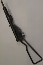Pistolet maszynowy przystosowany do amunicji pistoletowej 9x19 Parabellum. Kolba metalowa, ramowa, odłączana. Brak magazynka. Stan zachowania dobry. Na spodniej stronie chwytu magazynka nr broni FB 23303, poniżej BT. Na górnej powierzchni chwytu magazynka napis STEN Mk, na obudowie...więcej Pistolet maszynowy przystosowany do amunicji pistoletowej 9x19 Parabellum. Kolba metalowa, ramowa, odłączana. Brak magazynka. Stan zachowania dobry. Na spodniej stronie chwytu magazynka nr broni FB 23303, poniżej BT. Na górnej powierzchni chwytu magazynka napis STEN Mk, na obudowie mechanizmu spustowego: S68. Na zatrzasku kolby nr S 307. Na języku spustowym S 307 |