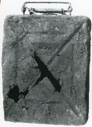Skrzynka na 3 granaty do moździerza Granatenwerfer 34 kal. 80mm. Prostokątna z przetłoczeniami. Na krótszej ścianie bocznej uchwyt do przenoszenia w drewnianej oprawie. Wewnątrz znajdują się 3 kielichowate uchwyty i zaczepy do mocowania granatów. Całość silnie skorodowana, ...więcej Skrzynka na 3 granaty do moździerza Granatenwerfer 34 kal. 80mm. Prostokątna z przetłoczeniami. Na krótszej ścianie bocznej uchwyt do przenoszenia w drewnianej oprawie. Wewnątrz znajdują się 3 kielichowate uchwyty i zaczepy do mocowania granatów. Całość silnie skorodowana, ubytki blachy i wżery. |