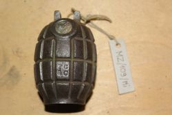 Granat obronny Mills m. 36. Skorupa jajowata, żeliwna, żłobkowana wzdłużnie i poprzecznie. U góry otwór do zamontowania zapalnika. Po obu stronach otworu dwa występy z otworem do mocowania łyżki. |