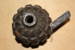 Niemiecki granat obronny Kugelhandgranate m. 1913. Kula wykonana ze stali, żłobiona wzdłużnie i poprzecznie, u góry centralnie umieszczone gwintowane gniazdo zapalnika. |