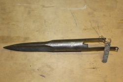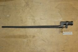 Bagnet kujny do karabinu systemu Mosin wz. 1891. Głownia czwórgranna, półokrągłe wybrania powierzchni płaskich. Tuleja mocująca z zatrzaskiem w kształcie litery "L". Bagnet najprawdopodobniej złamany - różnica wynosi 9 cm. |
