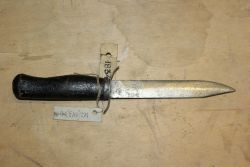 Nóż szturmowy sowiecki wz. 40. Głownia jednosieczna, zwężająca się niesymetrycznie do sztychu. Jelec stalowy wygięty w literę S. Rękojeść drewniana, chwyt anatomiczny. Na klindze bicie "1942". |