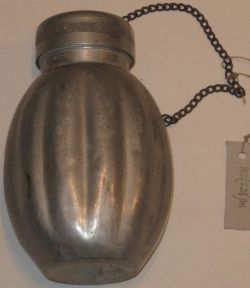 Polska manierka wz. 1937 r. Korpus i nakrętka aluminiowe, połączone łańcuszkiem. Kształt elipsy spłaszczonej na dole i jednej ze ścian, ściana przeciwległa wypukła, moletowana. Bicia: na szyjce "Światowid" i nr 46852, na nakrętce "pat. nr 26727. |