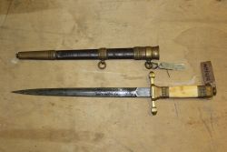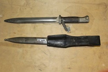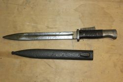 Bagnet niemiecki do karabinu systemu Mauser wz. 84/98/34. Głownia stalowa, jednosieczna, o jednym zbroczu. Głowica i jelec stalowe, okładki moletowane, bakelitowe. Pochwa stalowa, żabka skórzana, szyta i nitowana. |