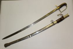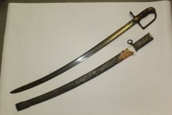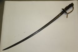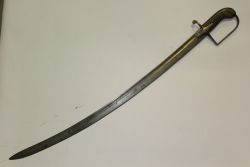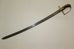 Francuska szabla wz. 1822. Głownia stalowa, jednosieczna, z jednym szerokim i drugim wąskim zbroczem przy grzbiecie. Rękojeść zamknięta, brak okładzin - chwyt owinięty materiałem. Jelec tarczkowy, mosiężny, połączony kabłąkiem z kapturkiem. Dwa dodatkowe kabłąki tworz...więcej Francuska szabla wz. 1822. Głownia stalowa, jednosieczna, z jednym szerokim i drugim wąskim zbroczem przy grzbiecie. Rękojeść zamknięta, brak okładzin - chwyt owinięty materiałem. Jelec tarczkowy, mosiężny, połączony kabłąkiem z kapturkiem. Dwa dodatkowe kabłąki tworzące kosz odcięte. Pochwa stalowa z jedną ryfką i ostrogą. |