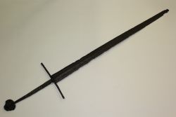 Średniowieczny miecz bastardzi. Głownia obosieczna, zbliżona w typie do wariantu "XVa" wg typologii Oakeshotta. Jelec typu "3", głowica okrągła typu "h", "i", "i.1" lub "j.1". Klinga złamana, na zastawie oraz na głowicy ślady zdobień wykonane z żółtego metalu. |