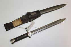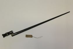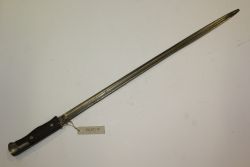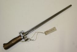Niemiecki bagnet wz. 1898. Głownia stalowa, prosta, jednosieczna, o jednym zbroczu, sztych spiłowany. Rękojeść drewniana, moletowana, głowica stalowa, jelca brak. Na głowni bicia: korona i "Erfurt". Pochwy brak. |