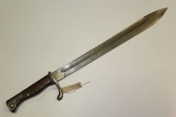 Bagnet niemiecki wz. 98/05. Głownia stalowa, rozszerzająca się, jedno zbrocze, na grzbiecie piła. Jelec stalowy, jednostronny, na końcu zawinięty w kierunku rękojeści. Rękojeść drewniana, moletowana, z osłoną przeciwpłomieniową. Pochwy brak. Na klindze bicie: "Deutsche M...więcej Bagnet niemiecki wz. 98/05. Głownia stalowa, rozszerzająca się, jedno zbrocze, na grzbiecie piła. Jelec stalowy, jednostronny, na końcu zawinięty w kierunku rękojeści. Rękojeść drewniana, moletowana, z osłoną przeciwpłomieniową. Pochwy brak. Na klindze bicie: "Deutsche Maschnent A.G. Duisburg". |