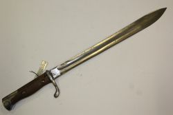 Bagnet niemiecki wz. 98/05. Głownia stalowa, rozszerzająca się, o jednym zbroczu, bez piły. Jelec stalowy, jednostronny, na końcu zawinięty w kierunku rękojeści. Rękojeść drewniana, moletowana, z osłoną przeciwpłomieniową. Pochwy brak. |