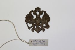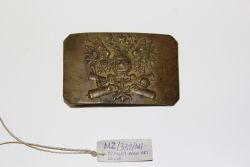 Mosiężna klamra od pasa artylerii rosyjskiej. Z przodu wytłoczone wypukle godło imperialne i panoplium w postaci dwóch skrzyżowanych luf armatnich. Z tyłu uszko i hak. |