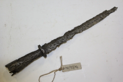 Żelazny grot lancy kawaleryjskiej. Silnie skorodowany, zachowana długość liścia 22 cm. U nasady tulei dokuta tarczka żelazna. Prawdopodobnie grot lancy kawaleryjskiej z XVIII lub pierwszej połowy XIX w. Być może kozaków rosyjskich. |