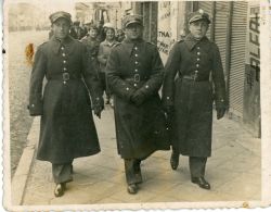 Fotografia przedstawiająca sylwetki trzech polskich żołnierzy idących ulicą Równego. Fotografia w tonacji czarno-białej, lekko pożółkła, z lewej strony rdzawa plamka. Na odwrocie odręczne napisy:189,3502. |