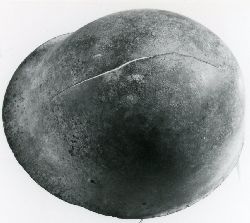Dzwon hełmu piechoty wz. 31. Brak fasunku i pasków, zachowały się tylko zaczepy i nity. Skorodowany, duże pęknięcie na szczycie i dwa mniejsze na krawędzi z prawej strony. |