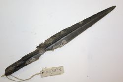 Grot włóczni z czasów kultury przeworskiej. Wykonany z żelaza, w kształcie wydłużonego liścia z obustronną granią przechodzącą przez środek. Zakończony tuleją przeznaczoną do osadzenia na drzewcu. Widoczne ślady patyny ogniowej. |