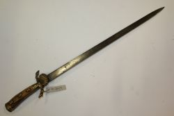Kordzik myśliwski. Głownia stalowa, prosta, obusieczna, płaska. Na całej długości widoczne ślady ornamentów. Jelec mosiężny w kształcie litery S z tarczką w kształcie muszli. Chwyt drewniany, nabijany trzema mosiężnymi guzami, zwieńczony mosiężną głowicą. |