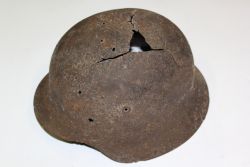 Stalhelm m. 42. Dzwon stalowy z daszkiem i nakarczkiem. Rant wywinięty na zewnątrz. Jeden duży i trzy mniejsze otwory pokorozyjne oraz liczne pęknięcia na powierzchni. Fasunku brak. |