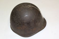 Hełm SSz 40. Dzwon stalowy z niewielkim daszkiem i wyobleniami z boków chroniącymi uszy. Na szczycie dwa otwory i pęknięcie. Brak wyposażenia wewnętrznego. |
