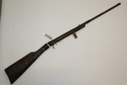 Wiatrówka łamana. Lufa i część łoża stalowe, kolba drewniana, oddzielona od reszty egzemplarza. |