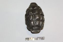 Ręczny granat obronny F-1. Skorupa stalowa w kształcie jaja, nacinana pionowo i poziomo. Brak zapalnika i łyżki. |