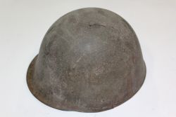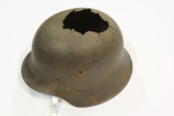 Polski hełm wz. 31. Dzwon stalowy z niewielkim daszkiem. Na szczycie pęknięcie dł. ok. 10 cm. Wewnątrz uszka do mocowania paska, fasunku oraz paska brak. |