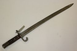 Jataganowy bagnet austriacki wz. 1870. Głownia stalowa, o jednym zbroczu, lekko zakrzywiona. Rękojeść drewniana, głowica i jelec z pierścieniem stalowe. Dół jelca haczykowato wygięty w kierunku sztychu. |