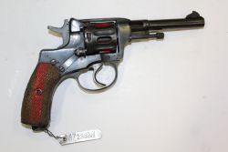 Rewolwer Nagant wz. 1895 kal. 7,62 mm w wersji szkolnej. Całość, za wyjątkiem okładek chwytu stalowa, te wykonane z drewna. Bębenek siedmiokomorowy, stały, z mechanizmem uszczelniającym. Okno dosyłania z prawej strony, pod lufą pobojczyk do wybijania łusek. Broń przystosow...więcej Rewolwer Nagant wz. 1895 kal. 7,62 mm w wersji szkolnej. Całość, za wyjątkiem okładek chwytu stalowa, te wykonane z drewna. Bębenek siedmiokomorowy, stały, z mechanizmem uszczelniającym. Okno dosyłania z prawej strony, pod lufą pobojczyk do wybijania łusek. Broń przystosowana do zadań szkolnych - lufa oraz komory bębenka rozwiercone, ucięta iglica kurka. Oznaczenia na lufie, chwycie i komorach czerwoną farbą. Bicia: na chwycie "ZB" w okręgu, "U", oraz cyfra 1, na szkielecie rok 1945, strzała w trójkącie wpisanym w koło - oznaczenie kodowe zakładów w Tule, nr "JA SZCZ 605". |