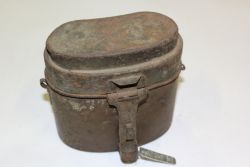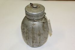 Polska manierka wz. 1937 r. Korpus i nakrętka aluminiowe, połączone łańcuszkiem. Kształt elipsy spłaszczonej na dole i jednej ze ścian, ściana przeciwległa wypukła, moletowana. Bicia: na szyjce "Światowid Myszków 1939" i nr 35893, na nakrętce "pat. nr 26727. |