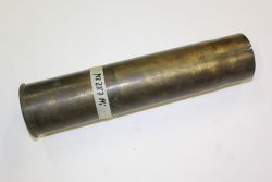 Mosiężna łuska armatnia kal. 75 mm do armaty Schneider wz. 1897. Kryza wystająca, spłonka zbita, na dnie bicia: "75P", pięcioramienna gwiazdka, "S" i "OF" w okręgach oraz "Pk2P27DZ". |