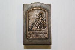 Podstawka na serwetki. Wykonana z blachy stalowej, austrowęgierskiej wpinki pamiątkowej za bitwę pod Isonzo 1915 r. oraz fragmentu pierścienia wiodącego pocisku artyleryjskiego. |