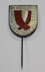 Wpinka pamiątkowa z okazji 35 rocznicy zakończenia II wojny światowej. Tarcza z napisem: 35 rocznica zwycięstwa i gałązkami lauru w otoku. W środku tarczy skrzyżowane flagi ZSRR i Polski. Mocowana przy pomocy stalowej igły. |