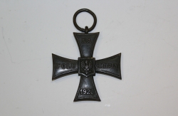 Mosiężny krzyż równoramienny. Na awersie, na ramionach krzyża napis: NA POLU CHWAŁY 1920, pośrodku, na tarczy orzeł w koronie. Na rewersie napis: WALECZNYM, miecz, wieniec laurowy i wybity nr odznaczenia: 20827. Brak wstążki, zachowało się kółko. |
