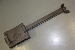 Masywny Lewar- podnośnik działający dzięki zębatej przekładni ręcznej napędzanej korbą. Widoczna sygnatura: 83884 U6. Skrzynka przekładni składana na przetyczki. Do łapy lewara wtórnie dospawano fragment stalowego pręta. Nie zachowały się elementy drewniane znane z podo...więcej Masywny Lewar- podnośnik działający dzięki zębatej przekładni ręcznej napędzanej korbą. Widoczna sygnatura: 83884 U6. Skrzynka przekładni składana na przetyczki. Do łapy lewara wtórnie dospawano fragment stalowego pręta. Nie zachowały się elementy drewniane znane z podobnych lewarów i korba. Ten konkretny egzemplarz został wykopany przypadkowo w pobliżu Brany Szczebrzeskiej w Zamościu.Lewarów tego typu używano np. przy czołgach Renault FT 17 i samochodach pancernych wz. 1929. |