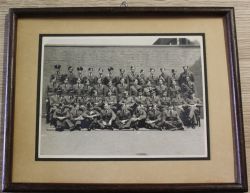 Fotografia czarno-biała przedstawiająca grupę polskiego personelu lotniczego w Anglii w czasie II Wojny Światowej. Z tyłu napis:RAF Station Bramcote Nuneaton 22.IV.1942 England. Fotografia w oszklonej ramie. |