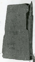 Magazynek do karabinu p. panc. wz. 35 "Ur" z dwoma nabojami. Skorodowany na całej powierzchni, miejscami ubytki blachy. Wewnątrz magazynka sprężyna blaszana, sprawna. |