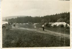 Fotografia czarno-biała przedstawiająca postać (słabo widoczną) na tle obozowiska, wzdłuż ścieżki rozmieszczone namioty. Na odwrocie adnotacja ołówkiem: "Na obozie 1933 r." |