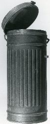 Puszka na niemiecką maskę przeciwgazową M 30 nowszego typu. Powierzchnia żłobkowana z dwoma dookolnymi przetłoczeniami. Posiada trzy uchwyty pasków nośnych i grzybkowate zapięcie. Przy pokrywie brak zamknięcia. Brak pasów nośnych. Skorodowana, pozostałości farby. Brak wid...więcej Puszka na niemiecką maskę przeciwgazową M 30 nowszego typu. Powierzchnia żłobkowana z dwoma dookolnymi przetłoczeniami. Posiada trzy uchwyty pasków nośnych i grzybkowate zapięcie. Przy pokrywie brak zamknięcia. Brak pasów nośnych. Skorodowana, pozostałości farby. Brak widocznych sygnatur. |