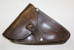 Skórzana kabura, prawdopodobnie na francuski pistolet Ruby/Cebra lub pochodny pistolet produkcji Hiszpańskiej. Trójkątna, szyta z trzech kawałków skóry i nitowana żelaznymi nitami na zakończeniach szwów. Zamykana na knopik. Wewnątrz widoczne otarcia i przebarwienia od broni. |