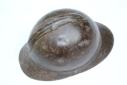 Hełm francuski Adrian wz. 1915. Skorupa jednolita w kształcie półsfery z integralnym rondem. Na szczycie grzebień mocowany na cztery nity. Wewnątrz brak fasunku. |