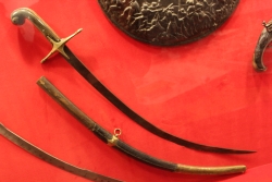 Szabla turecka. Głownia stalowa, jednosieczna, bez zbroczy. Rękojeść typu otwartego, okładziny chwytu z rogu, warkocz mosiężny, zdobiony. Jelec prosty, mosiężny, zwieńczony podłużnymi gałkami w kształcie szyszek, integralne wąsy. Pochwa drewniana, obciągnięta szytą sk...więcej Szabla turecka. Głownia stalowa, jednosieczna, bez zbroczy. Rękojeść typu otwartego, okładziny chwytu z rogu, warkocz mosiężny, zdobiony. Jelec prosty, mosiężny, zwieńczony podłużnymi gałkami w kształcie szyszek, integralne wąsy. Pochwa drewniana, obciągnięta szytą skórą, z jedną ryfką i wysokim trzewikiem z mosiądzu. |