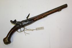 Pistolet z zamkiem skałkowym. Lufa stalowa, niegwintowana, kal. ok. 14 mm. Łoże drewniane, zakończone mosiężną nakładką w kształcie kopuły. Na chwycie zdobienia rytowane w drewnie. Pod lufą pobojczyk. |