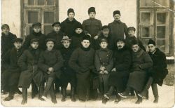 Fotografia czarno-biała. Przedstawia grupę członków Polskiej Organizacji Wojskowej. |
