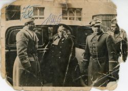 Czarno-biała fotografia przedstawiająca przywódcę Jugosławii J. Bros-Tito i marszałka Polski M. Rolę-Żymierskiego. Na zdjeciu odręcznie dopisano datę 7 XI 1945. Na odwrocie nieczytelna, pisana odręcznie adnotacja. |