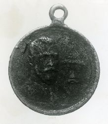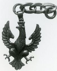 Orzeł polski w koronie, wykonany z blachy mosiężnej. Z tyłu głowy przylutowana pętla z paska blachy mosiężnej, w nim mosiężne kółko, do którego przymocowane są trzy owalne, srebrne ogniwa łańcuszka i kolejne kółko mosiężne. Na odwrocie, na skrzydłach i ogonie ślad...więcej Orzeł polski w koronie, wykonany z blachy mosiężnej. Z tyłu głowy przylutowana pętla z paska blachy mosiężnej, w nim mosiężne kółko, do którego przymocowane są trzy owalne, srebrne ogniwa łańcuszka i kolejne kółko mosiężne. Na odwrocie, na skrzydłach i ogonie ślady lutowania. Brak symboli i sygnatur. |