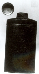 Pojemnik na leki PCK. Wykonany z tłoczonej blachy, emaliowany na kolor zloty. W przekroju eliptyczny. Zamykany nakładanym korkiem bez gwintu. W przedniej części znajduje się wytłoczony znak krzyża i napis PCK. |